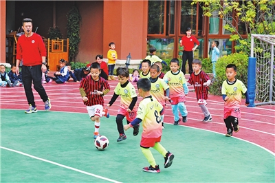 随后,孩子们回到幼儿园,在桌面足球、面部彩绘、足球对对碰、手指足球赛、双人运球比赛等35个足球游戏点游玩。在富有趣味的游戏中,增强身体素质,锻炼协调能力。