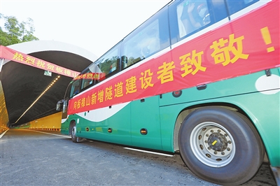 在板樟山新增隧道通车仪式现场,挂着“向板樟山新增隧道建设者致敬”的横幅随处可见。历时两年,板樟山新增隧道如期投入使用,这当中凝聚着无数建设者的坚守与努力。